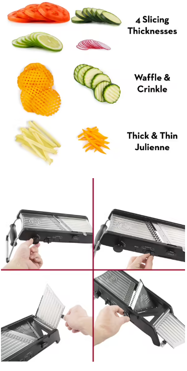 - 4 x adjustable slicing thicknesses, 2 x julienne and 1 x waffle cut